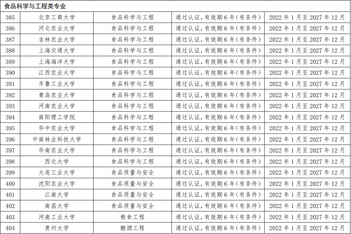 其中,北京工商大学、河北农业大学、吉林农业大学、上海交通大学、上海海洋大学、江西农业大学等20所高校的食品科学与工程类专业通过认证,认证结论有效期均为 6 年,自2022 年 1 月起至 2027 年 12 月止。