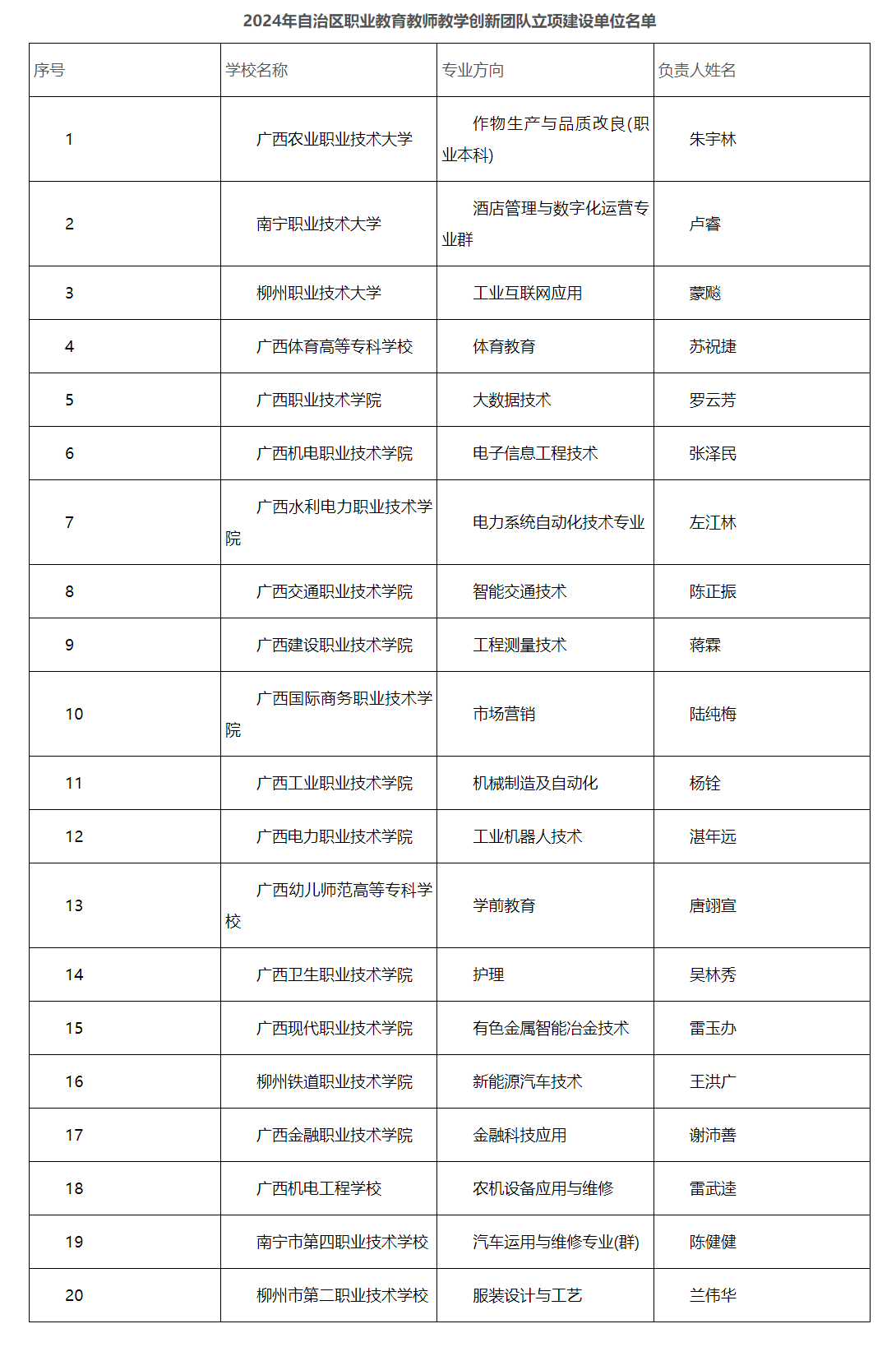 根据《自治区教育厅关于开展2024年自治区职业教育教师教学创新团队立项建设工作的通知》(桂教教师〔2024〕14号)精神,经申报推荐、资格审查、专家评审等环节,遴选出20个自治区职业教育教师教学创新团队立项建设,现将立项建设单位名单(见附件)予以公示。公示期为5个工作日,时间从2024年7月12日起至2024年7月18日。
