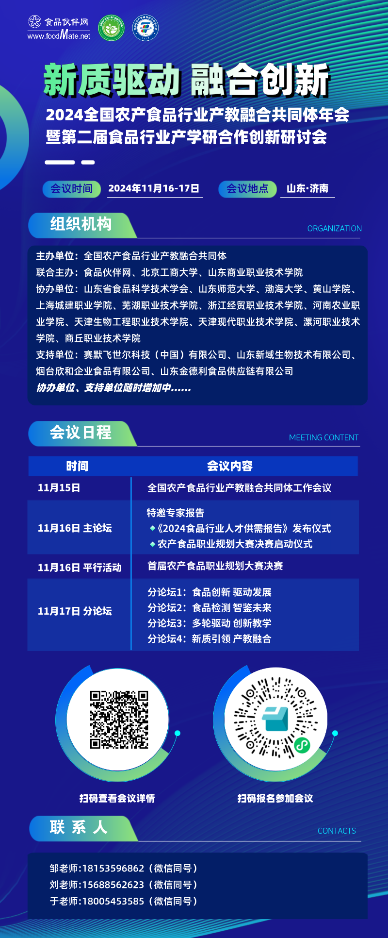 为深入贯彻党的二十大精神,深化职普融通、产教融合、科教融汇,搭建食品行业交流平台,探讨推动科研成果转化,变革人才培养模式,引领食品学科发展,促进食品科技进步的新对策、新思路、新趋势、新机遇,做实产学研协同创新,加快提升农产食品行业新质生产力发展,全国农产食品行业产教融合共同体将于2024年11月16-17日在山东·济南召开“2024全国农产食品行业产教融合共同体年会暨第二届食品行业产学研合作创新研讨会”。具体通知如下: